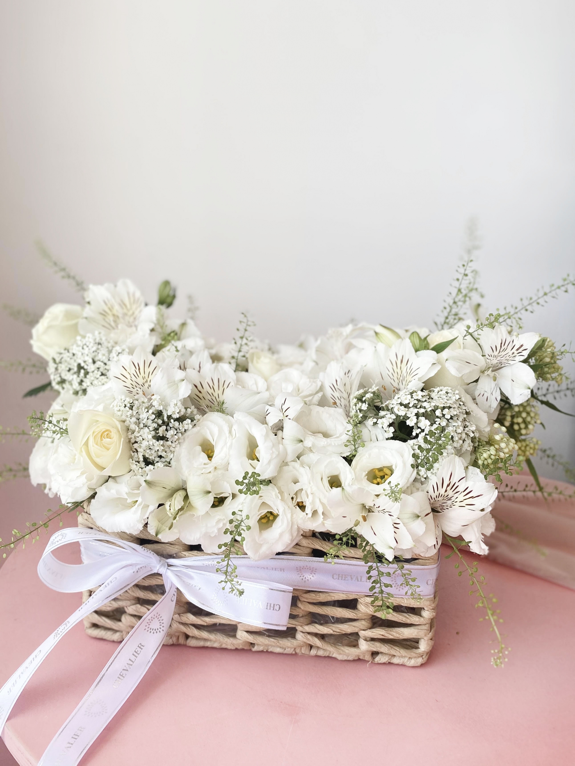 סידור לבן מרהיב בסלסלת קש עדינה.