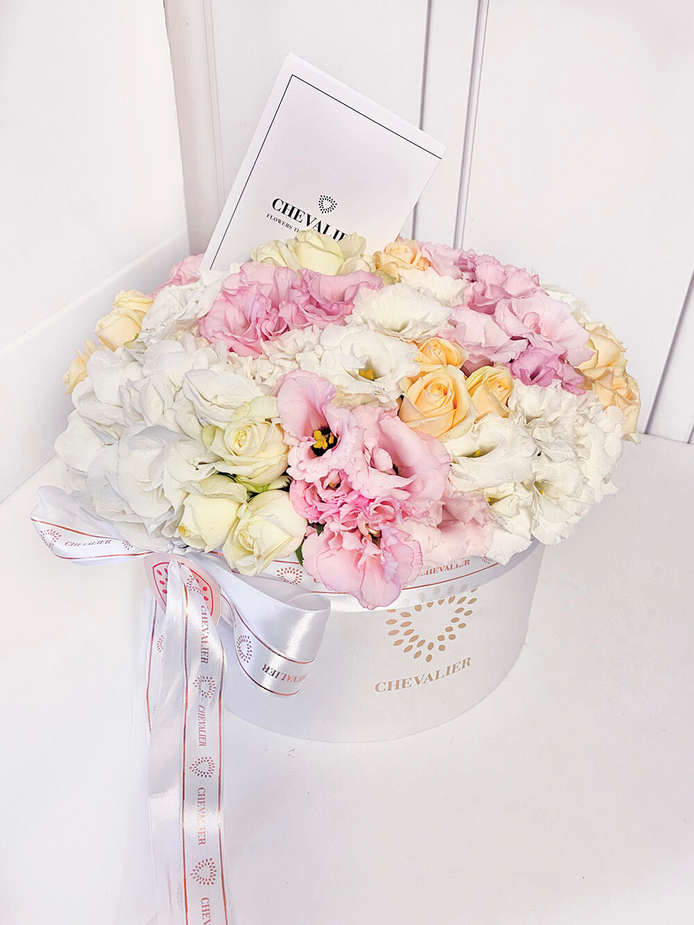 קופסת פרחים ענקית ומרשימה, המשלבת מגוון רחב של פרחים בגווני ורוד בייבי, לבן, קרם ופיץ (אפרסק) את הסידור למשוגע ונחשק.