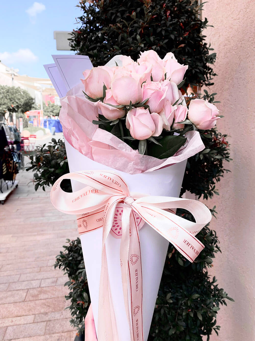 קונוס לבן פנינה יוקרתי עם סידור של ורדים ורודים עדינים, בכמות לפי בחירת הלקוח.