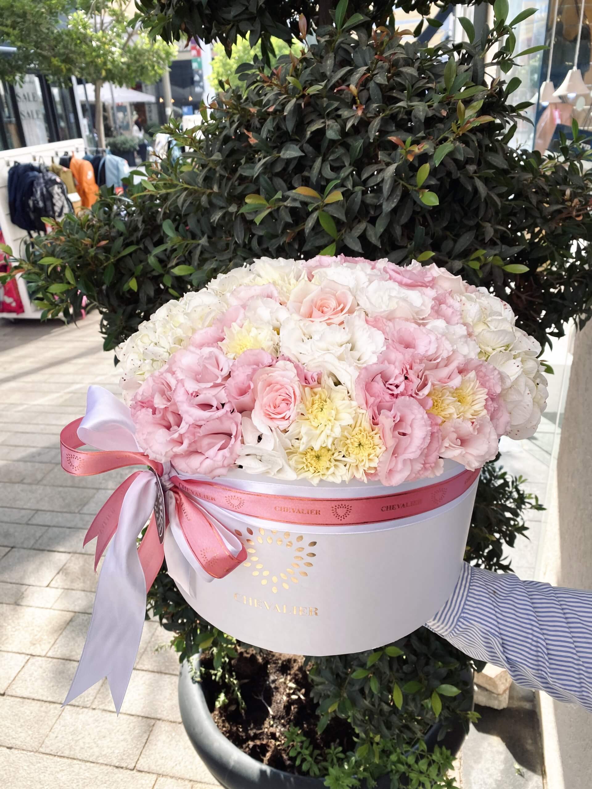 קופסאת פרחים ענקית, בסידור משוגע ונחשק הכולל כ- 60 פרחים בצבעי ורוד, צהוב ולבן.