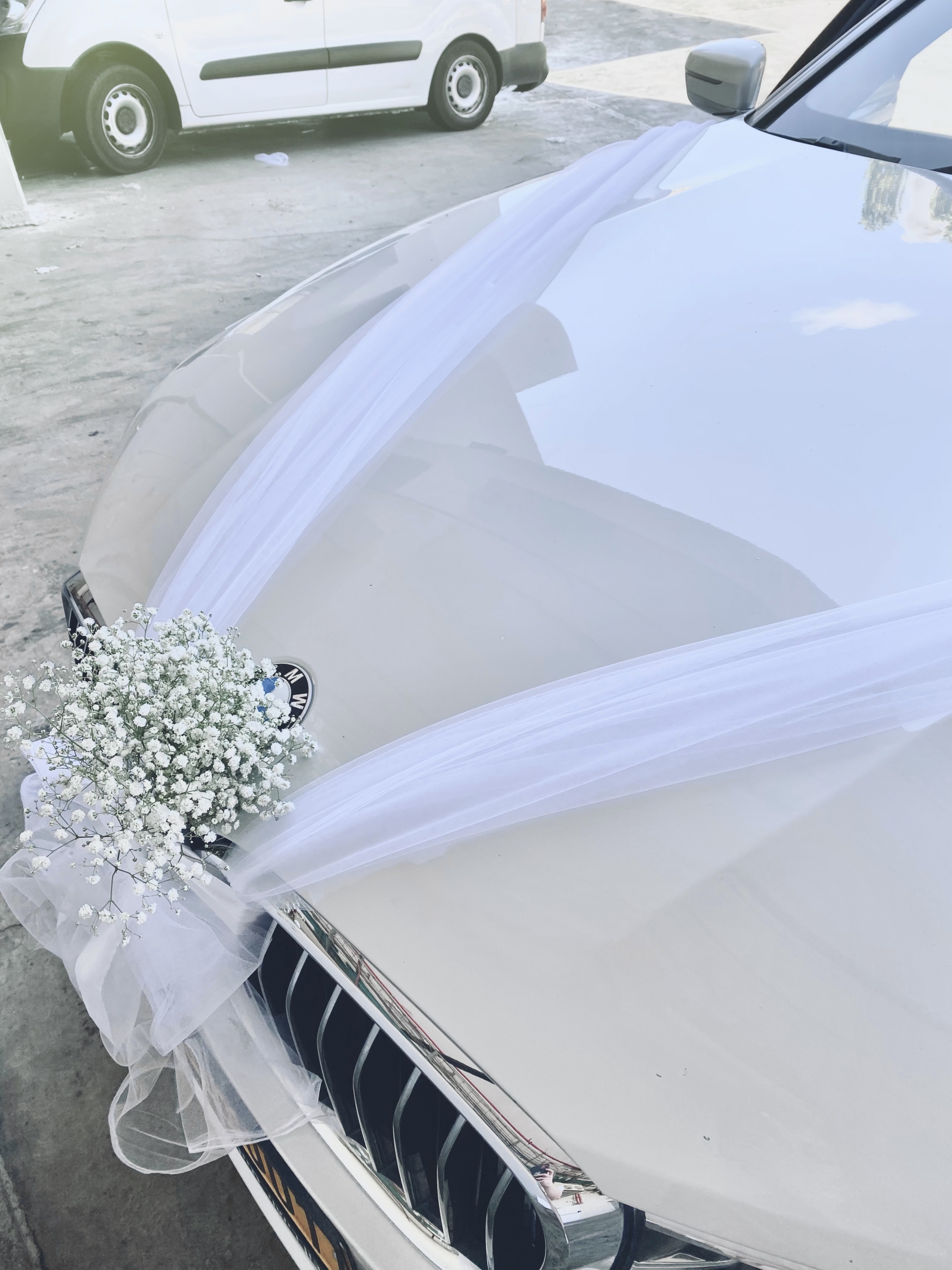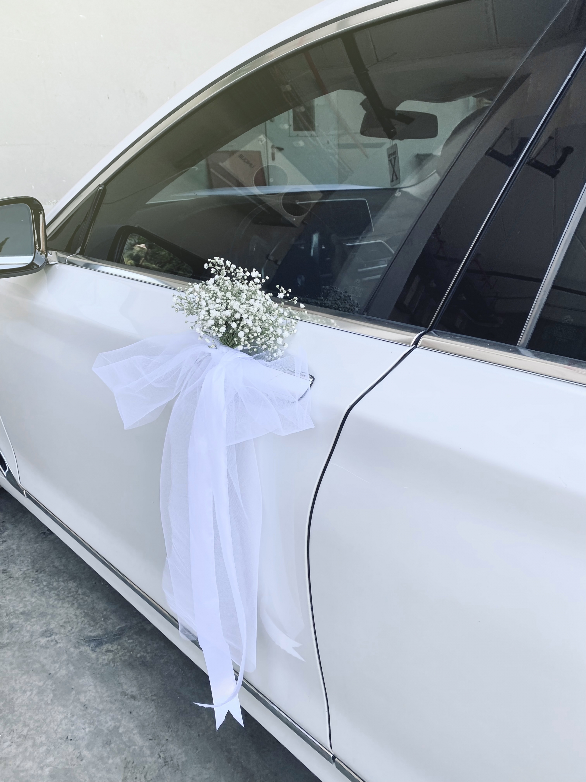 קישוט רכב קלאסי, עשיר ורומנטי המורכב מ- זר גיבסנית ופפיון מטול לבן לכל ידית (4 ידיות), זר גיבסנית ופפיון טול לקדמת הרכב וטול משני צדי מכסה המנוע.